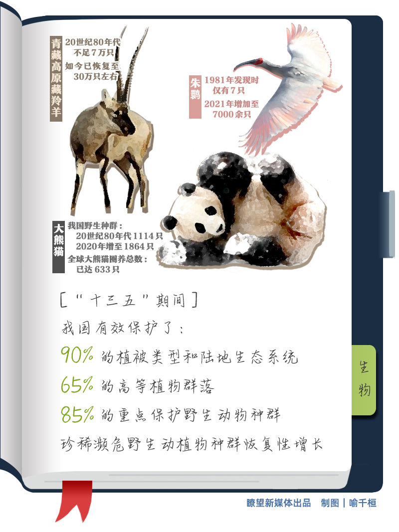 瀕危野生動(dòng)植物保護(hù)不斷強(qiáng)化。“十三五”期間,我國(guó)有效保護(hù)了90%的植被類型和陸地生態(tài)系統(tǒng)、65%的高等植物群落,85%的重點(diǎn)保護(hù)野生動(dòng)物種群,大熊貓、朱鹮、藏羚羊、蘇鐵等珍稀瀕危野生動(dòng)植物種群實(shí)現(xiàn)恢復(fù)性增長(zhǎng)。
