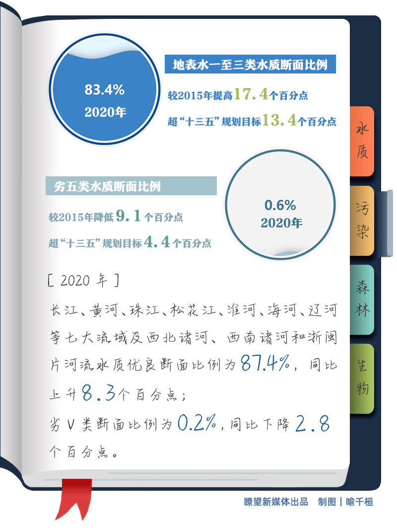 碧水更多,水質(zhì)更優(yōu)良。地表水Ⅰ至Ⅲ類水質(zhì)斷面比例由66%上升至83.4%,提高17.4個(gè)百分點(diǎn),超過“十三五”規(guī)劃目標(biāo)13.4個(gè)百分點(diǎn);劣Ⅴ類水質(zhì)斷面比例由9.7%下降到0.6%,降低9.1個(gè)百分點(diǎn),超過“十三五”規(guī)劃目標(biāo)4.4個(gè)百分點(diǎn)。