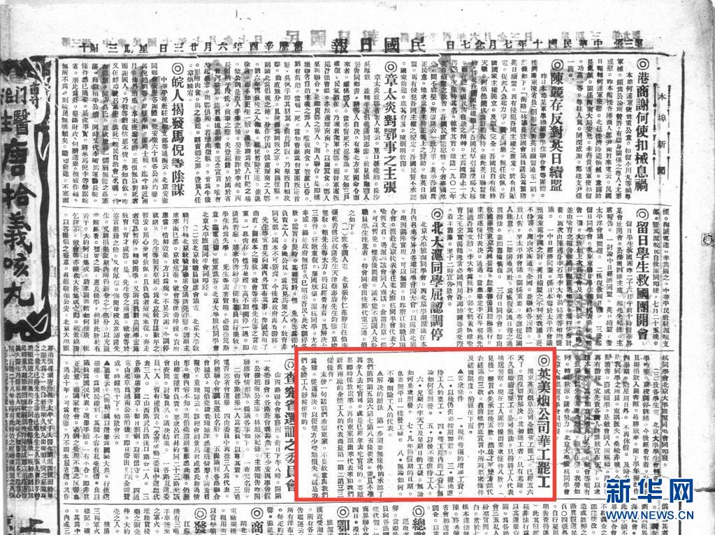1921年7月27日的《民國(guó)日?qǐng)?bào)》上登載了上海浦東英美煙草公司華工罷工的消息。新華社發(fā)(上海圖書館提供)