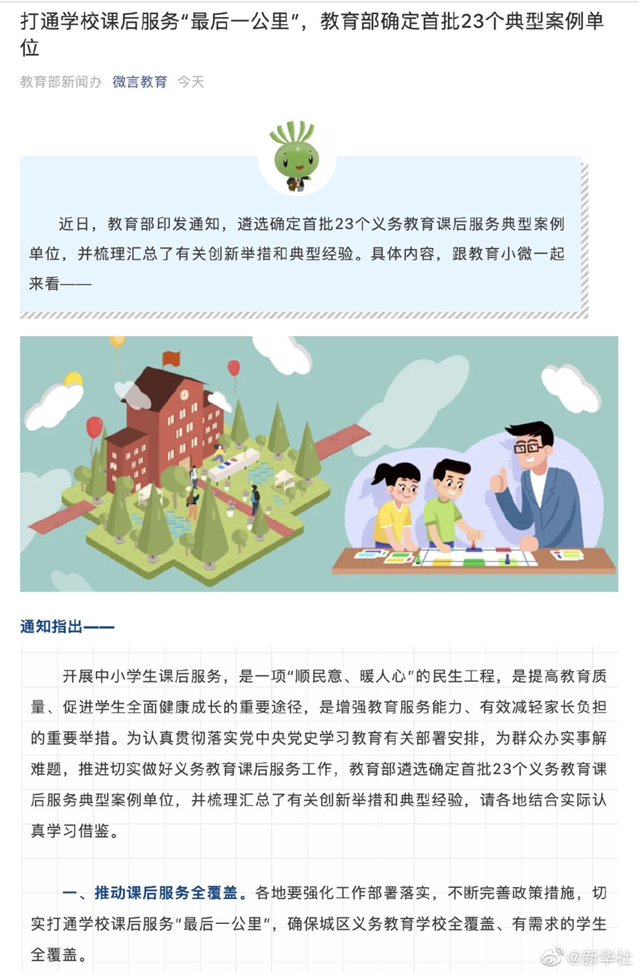 據(jù)教育部政務(wù)新媒體“微言教育”公眾號22日消息,教育部近日印發(fā)通知,為推進做好義務(wù)教育課后服務(wù)工作,遴選確定首批23個義務(wù)教育課后服務(wù)典型案例單位,并梳理匯總了有關(guān)創(chuàng)新舉措和典型經(jīng)驗,要求各地結(jié)合實際學習借鑒。通知指出,課后服務(wù)結(jié)束時間原則上不早于當?shù)仄毡榈恼O掳鄷r間后半小時;學校對有特殊需要的學生,可以提供延時托管服務(wù),切實解決好家長接學生困難問題。學校服務(wù)性收費和代收費具體政策由各省份制訂,嚴禁以課后服務(wù)名義亂收費。 (記者余俊杰)
