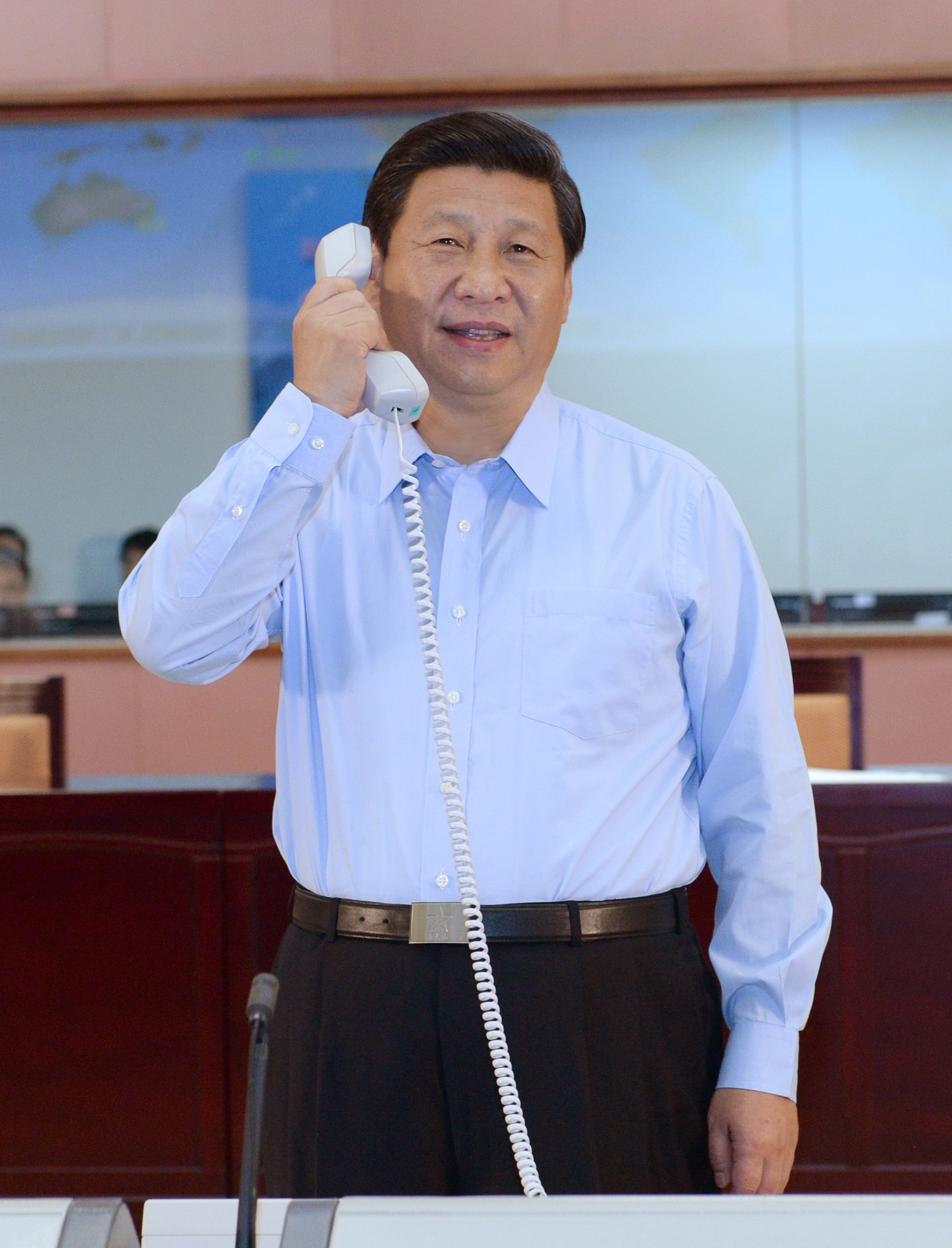 ↑2013年6月24日,習(xí)近平來到北京航天飛行控制中心,同正在天宮一號執(zhí)行任務(wù)的神舟十號航天員聶海勝、張曉光、王亞平親切通話。