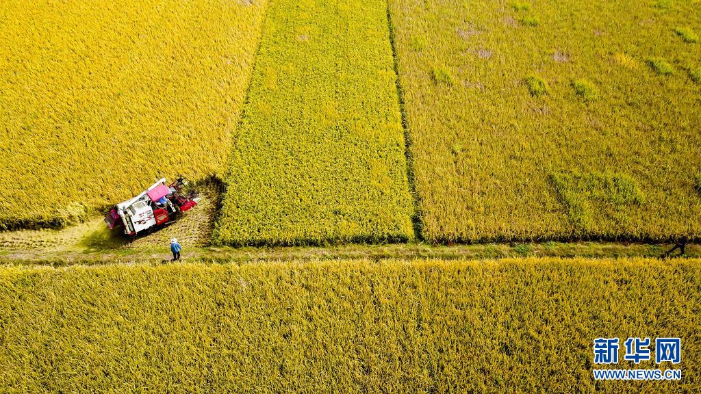 2020年10月21日,在山東省棗莊市臺兒莊區(qū)邳莊鎮(zhèn),收割機(jī)在收獲水稻(無人機(jī)照片)。新華社記者 郭緒雷 攝