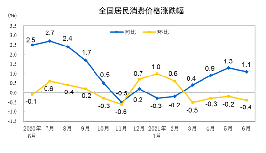 2021年6月CPI同比上漲1.1% 環(huán)比下降0.4%