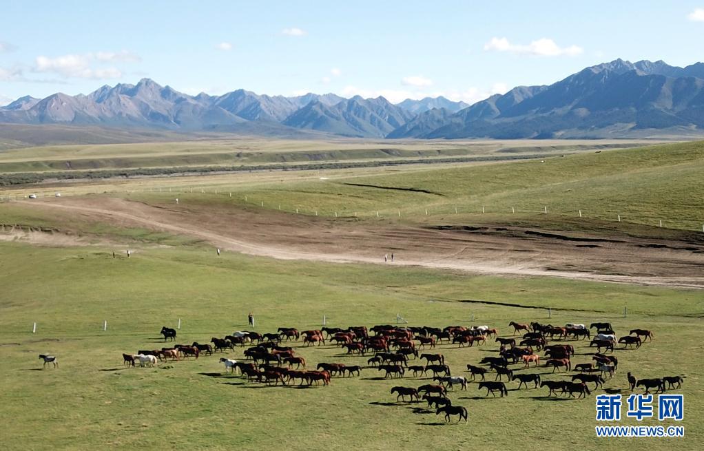 在祁連山腳下的山丹馬場拍攝的馬群(2019年9月10日攝,無人機(jī)照片)。新華社記者 馬寧 攝