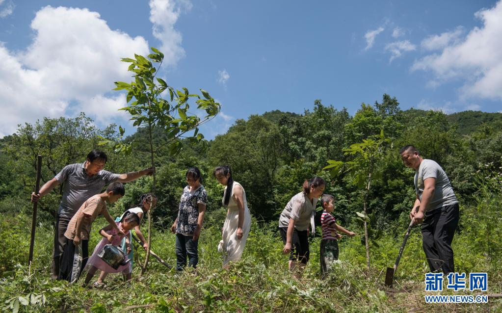 姚祖元(右一)與家人一起種樹(2019年7月13日攝)。在秦嶺深處的陜西省漢中市留壩縣火燒店鎮(zhèn),姚家五代人歷時(shí)70年深耕秦嶺的故事在當(dāng)?shù)丶矣鲬魰?,傳為佳話。新華社記者 陶明 攝