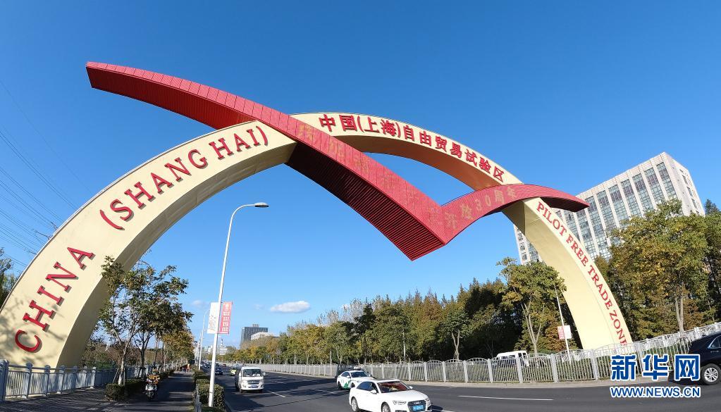 位于上海浦東新區(qū)楊高北路上的中國(上海)自由貿易試驗區(qū)標志門(2020年11月11日攝)。新華社記者 方喆 攝