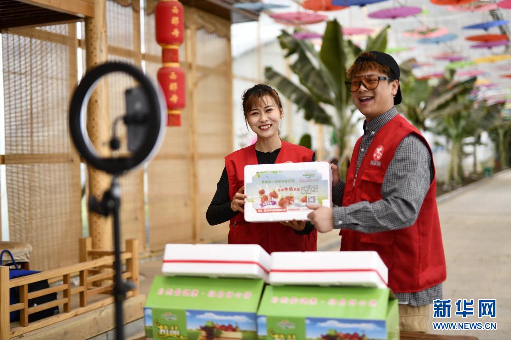 5月11日,工作人員在河北省唐山市豐潤區(qū)西那母生態(tài)旅游度假村內通過網絡直播的形式推介草莓。新華社記者 牟宇 攝