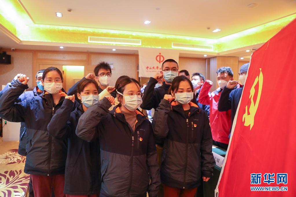 廣州中山大學附屬第一醫(yī)院馳援武漢醫(yī)療隊火線入黨的新黨員在武漢漢口醫(yī)院宣誓(2020年3月2日攝)。新華社發(fā)