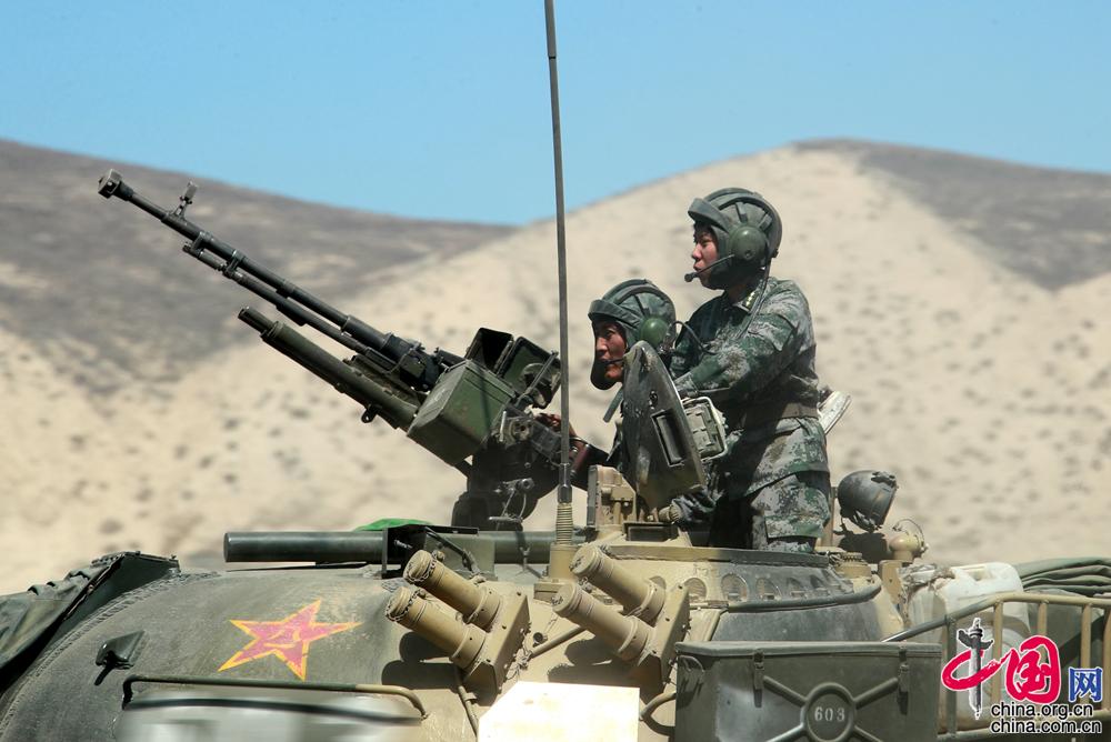 新疆軍區(qū)某合成團坦克二連政治指導員馬和帕麗(右一)組織戰(zhàn)術(shù)訓練的情景。袁凱 攝