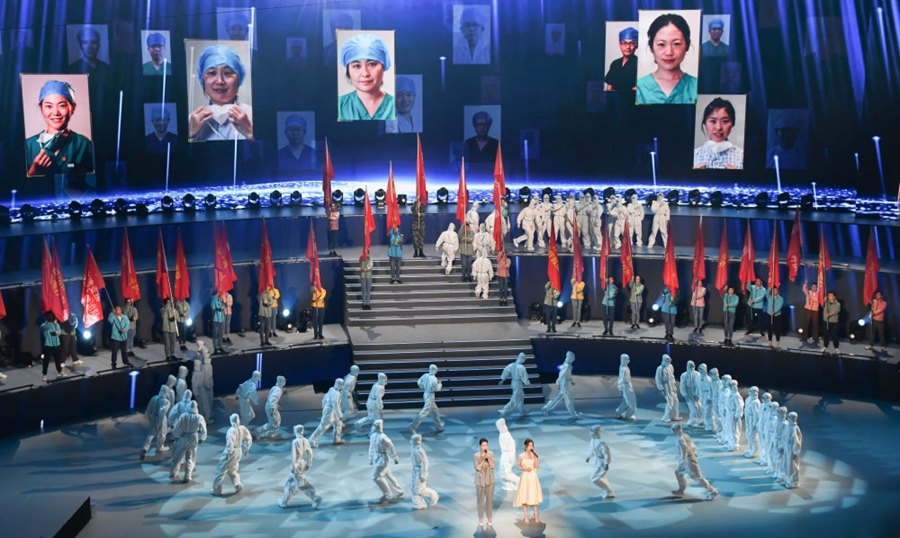2021年6月26日,在武漢舉行的湖北省慶祝中國共產(chǎn)黨成立100周年文藝晚會上再現(xiàn)抗疫英雄群像。