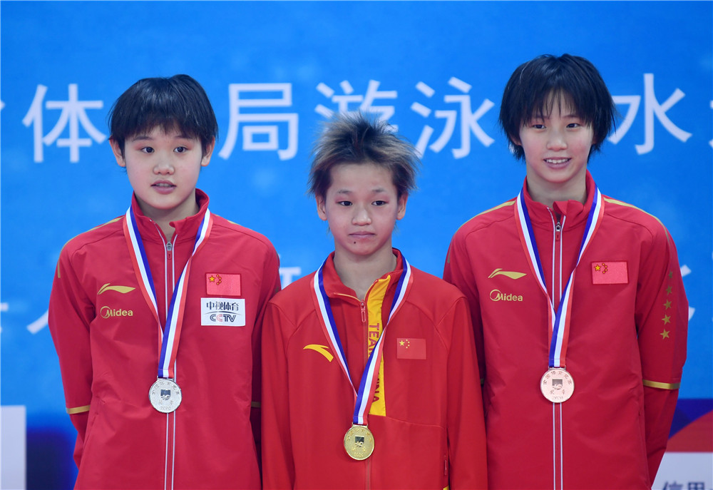 2020年10月4日,冠軍廣東海印隊(duì)選手全紅嬋(中)、亞軍北京水立方隊(duì)選手張家齊(左)和季軍上海浩沙隊(duì)選手陳芋汐在頒獎(jiǎng)儀式上。當(dāng)日,在河北奧體中心舉行的2020年全國(guó)跳水冠軍賽暨東京奧運(yùn)會(huì)、世界杯預(yù)選賽女子10米跳臺(tái)決賽中,全紅嬋奪得冠軍。新華社記者 王曉 攝