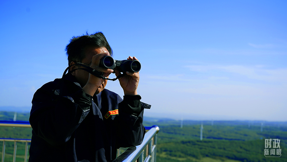 △防火瞭望員于成,自2001年起就在塞罕壩蔡木山值守,白天每隔15分鐘瞭望、記錄并報告一次。(總臺央廣記者潘毅拍攝)