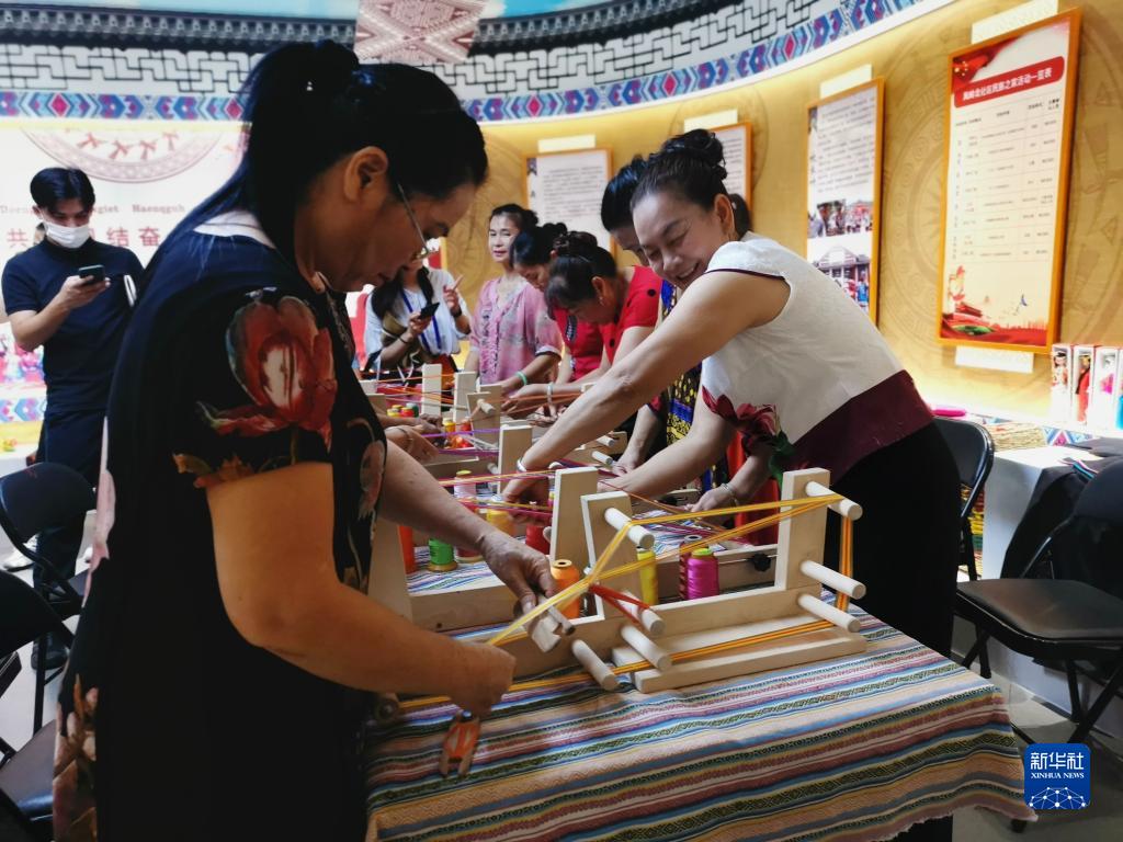 在廣西南寧市青秀區(qū)鳳嶺北社區(qū)民族之家,社區(qū)居民在用簡易織機制作壯錦(2020年7月21日攝)。新華社記者 黃慶剛 攝