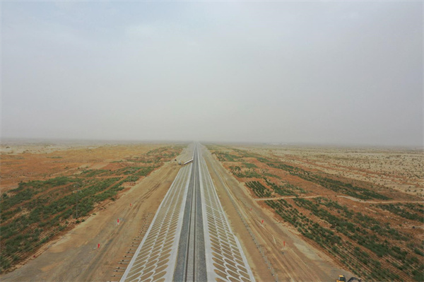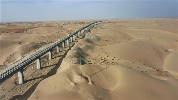 和若鐵路為國家重點鐵路建設項目,線路全長825.476公里,2018年12月開工建設,連通南疆和田地區(qū)和田市與巴音郭楞蒙古自治州若羌縣。完成鋪軌的和若鐵路與現(xiàn)有格庫鐵路、喀和鐵路、南疆鐵路連通,環(huán)繞塔克拉瑪干沙漠一周,構成世界首條環(huán)沙漠鐵路線。