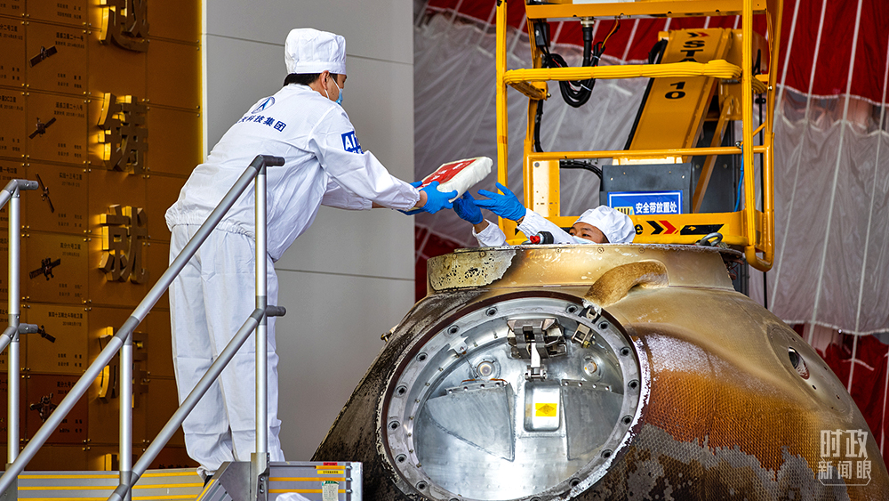△2021年9月27日,神舟十二號載人飛船返回艙開艙儀式在北京舉行,現(xiàn)場共同見證航天育種等搭載物品出艙。(圖/視覺中國)