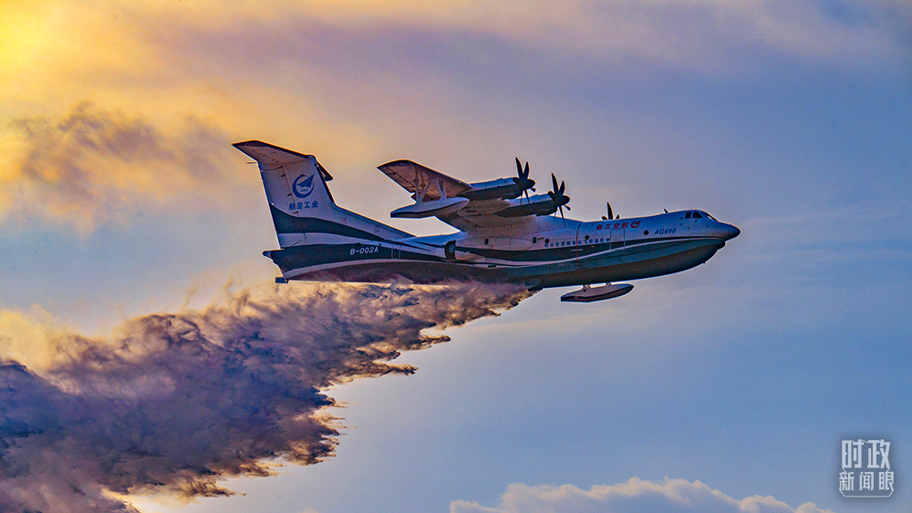 △2021年9月,廣東珠海,大型水陸兩棲飛機——“鯤龍”AG600演示空中投水,展示強大的火場滅火能力。(圖/視覺中國)
