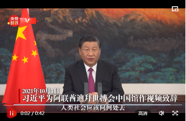 10月1日,國家主席習近平為阿聯(lián)酋迪拜世博會中國館作視頻致辭。