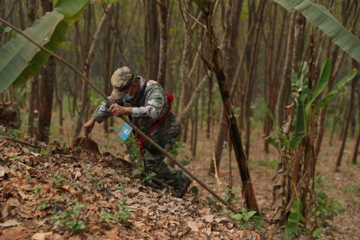 日前,記者跟隨段二文等人,走了一段他認為很普通的巡邊路。當(dāng)天,熟悉路況的段二文走在最前面,遇到不好通過的地方,他拿著砍刀幾下就清除了障礙。隨后穿越一片橡膠林,經(jīng)過一條用來區(qū)分國境線的石板路,抵達最終的目的地——S144-2號界樁。