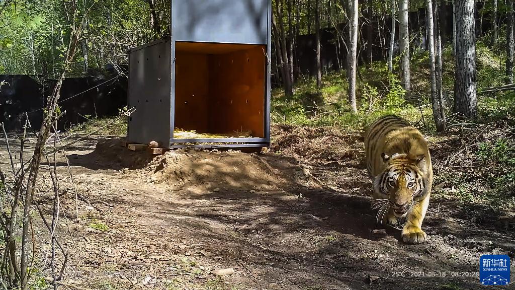 2021年5月18日,在黑龍江省穆棱林業(yè)局有限公司林場,之前在密山市獲得成功救護(hù)的野生東北虎從鐵箱子里走出,回歸自然(視頻截圖)。新華社發(fā)