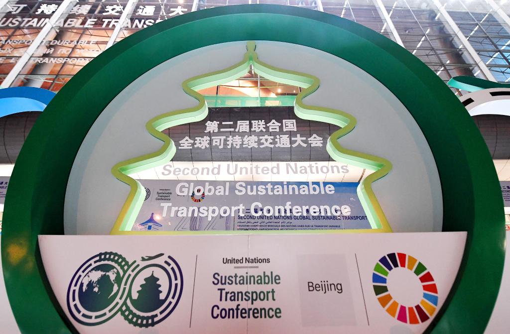 在北京國家會議中心拍攝的第二屆聯(lián)合國全球可持續(xù)交通大會標(biāo)志(10月14日攝)。新華社記者 李賀 攝