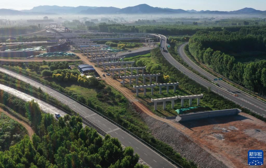 這是6月6日在遵化市境內(nèi)拍攝的京秦高速公路遵(遵化)秦(秦皇島)段與唐(唐山)承(承德)高速下院寺樞紐互通建設(shè)工地(無人機(jī)照片)。新華社記者 楊世堯 攝