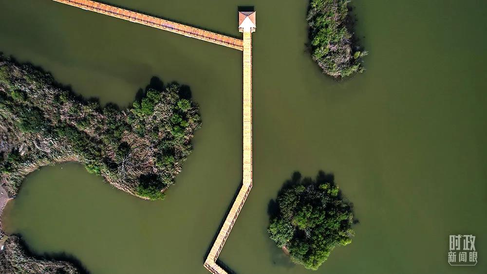 △黃河三角洲,延伸到水中的木質棧道。(總臺國廣記者李晉拍攝)