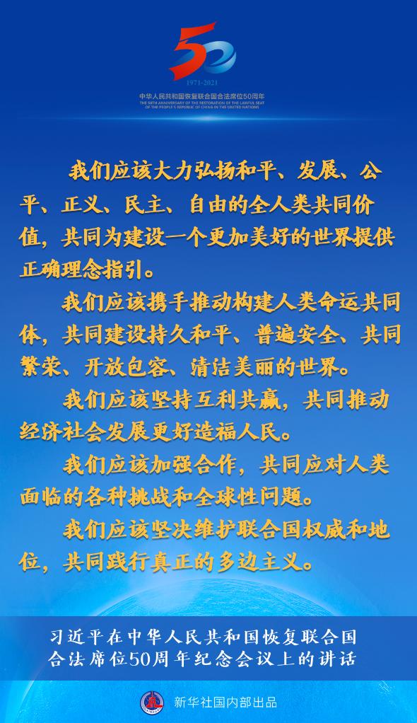 2021年10月25日,國(guó)家主席習(xí)近平在北京出席中華人民共和國(guó)恢復(fù)聯(lián)合國(guó)合法席位50周年紀(jì)念會(huì)議并發(fā)表重要講話。 新華社記者 李響 攝