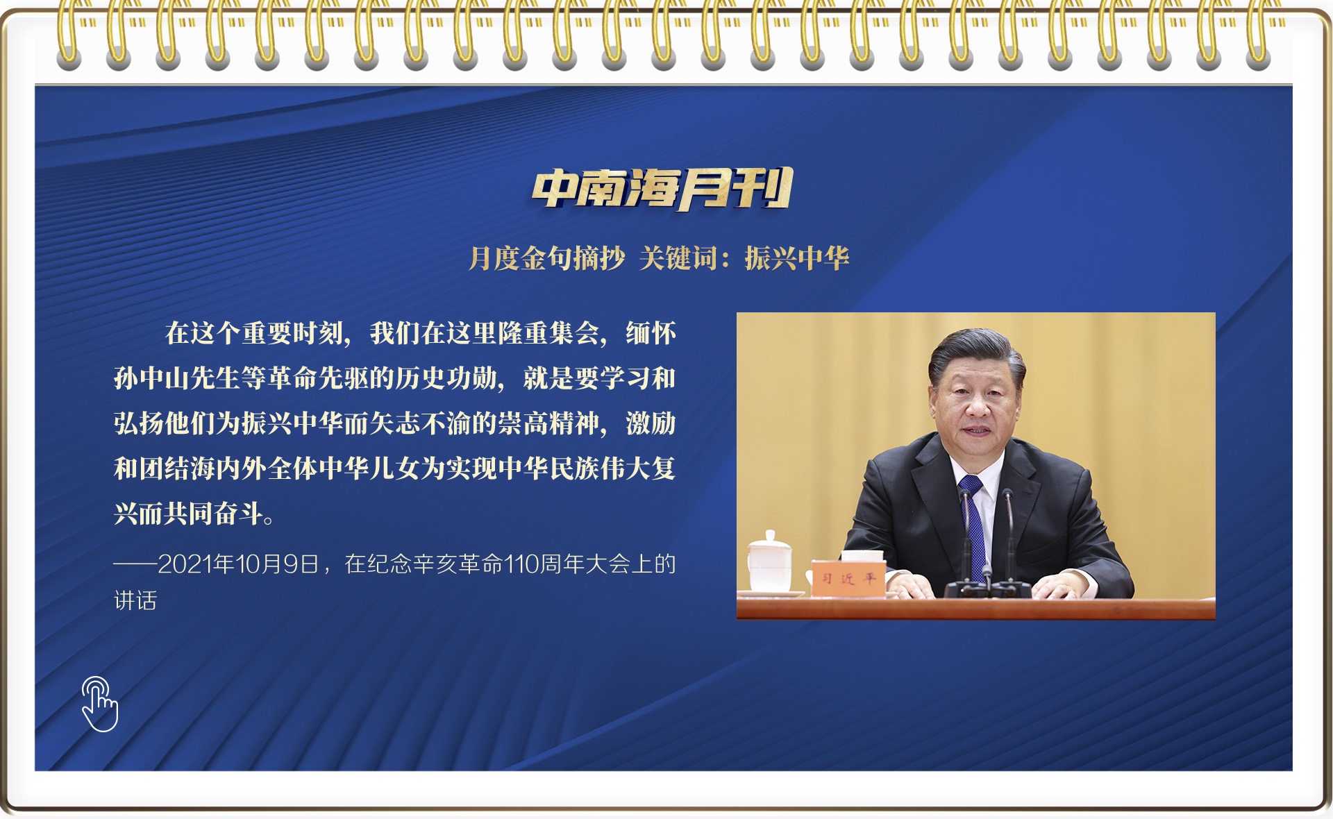 10月9日,紀念辛亥革命110周年大會隆重舉行,習近平總書記在會上發(fā)表重要講話,高度評價了辛亥革命的歷史功績和重大意義,回顧總結(jié)了中國共產(chǎn)黨繼承孫中山先生革命事業(yè)、團結(jié)帶領(lǐng)人民不懈奮斗的光輝歷程,深刻闡述了辛亥革命110年來的歷史啟示,鄭重宣示了堅持一個中國原則和“九二共識”、堅決遏制“臺獨”分裂活動、捍衛(wèi)國家主權(quán)和領(lǐng)土完整的堅強決心與堅定意志。