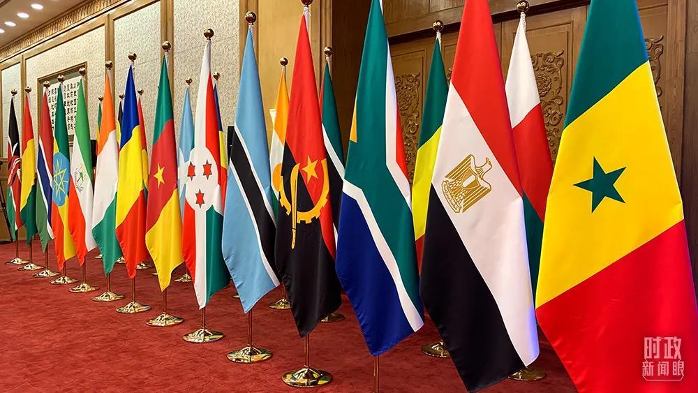 △東大廳內(nèi),中國和53個非洲國家國旗以及非洲聯(lián)盟旗幟組成的旗陣。(總臺央視記者范一鳴拍攝)