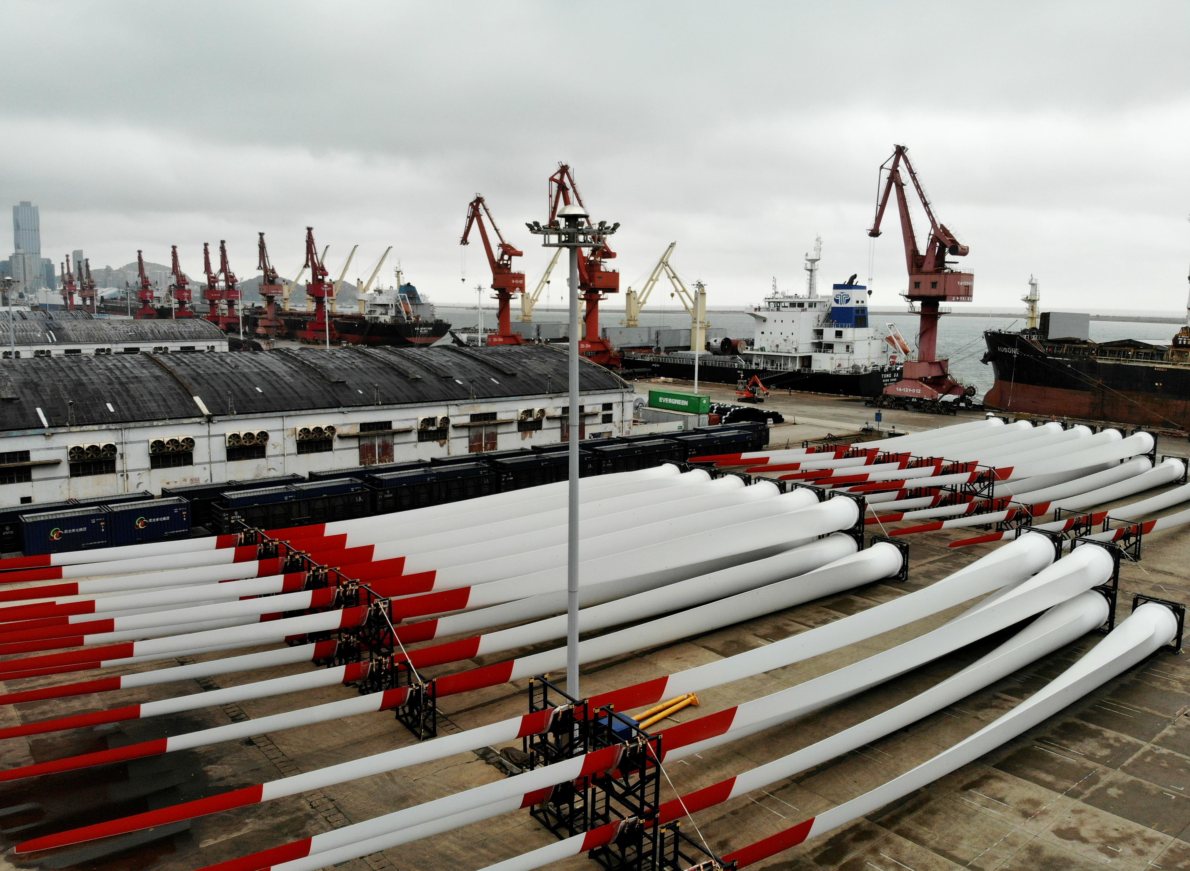 一批風(fēng)電葉片排放在江蘇連云港一碼頭等待裝船(7月27日攝,無人機照片)。新華社發(fā)(王春 攝)