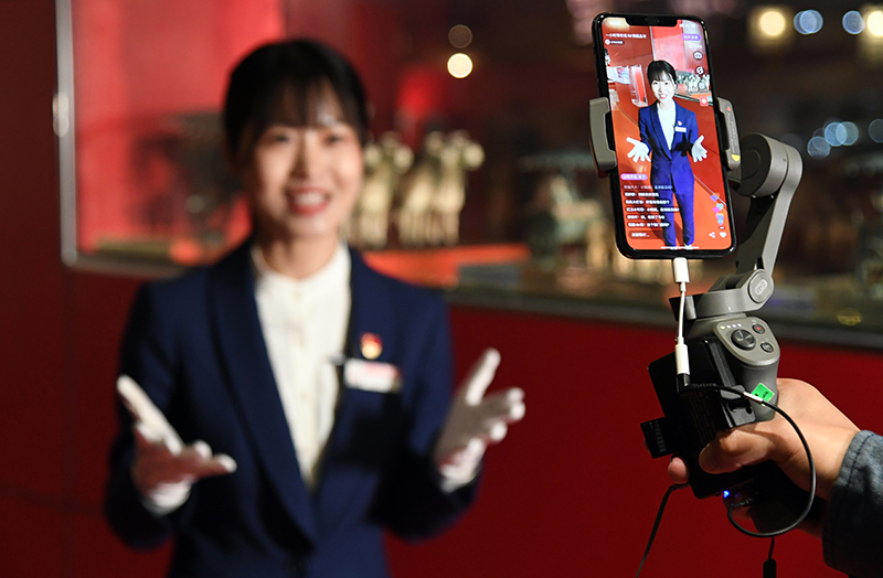 2020年4月30日,在北京汽車博物館,講解員曾紅娟通過網(wǎng)絡(luò)直播平臺為觀眾介紹館內(nèi)的藏品車。