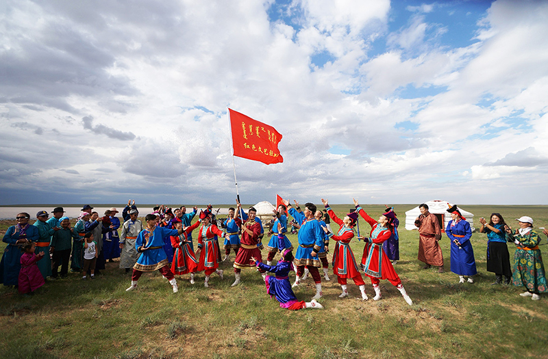 2018年8月22日,內(nèi)蒙古蘇尼特右旗烏蘭牧騎隊(duì)員在牧區(qū)演出。