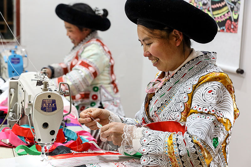 2021年2月3日,貴州省畢節(jié)市黔西縣新仁苗族鄉(xiāng)化屋村,苗族婦女在扶貧車間加工服裝。