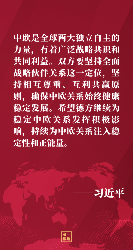 習(xí)近平強(qiáng)調(diào),中歐是全球兩大獨(dú)立自主的力量,有著廣泛戰(zhàn)略共識(shí)和共同利益。雙方要堅(jiān)持全面戰(zhàn)略伙伴關(guān)系這一定位,堅(jiān)持相互尊重、互利共贏原則,確保中歐關(guān)系始終健康穩(wěn)定發(fā)展。希望德方繼續(xù)為穩(wěn)定中歐關(guān)系發(fā)揮積極影響,持續(xù)為中歐關(guān)系注入穩(wěn)定性和正能量。