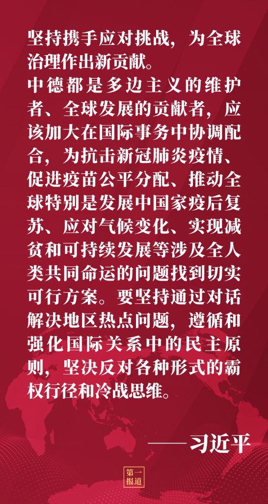 第三,堅(jiān)持?jǐn)y手應(yīng)對(duì)挑戰(zhàn),為全球治理作出新貢獻(xiàn)。中德都是多邊主義的維護(hù)者、全球發(fā)展的貢獻(xiàn)者,應(yīng)該加大在國(guó)際事務(wù)中協(xié)調(diào)配合,為抗擊新冠肺炎疫情、促進(jìn)疫苗公平分配、推動(dòng)全球特別是發(fā)展中國(guó)家疫后復(fù)蘇、應(yīng)對(duì)氣候變化、實(shí)現(xiàn)減貧和可持續(xù)發(fā)展等涉及全人類(lèi)共同命運(yùn)的問(wèn)題找到切實(shí)可行方案。要堅(jiān)持通過(guò)對(duì)話解決地區(qū)熱點(diǎn)問(wèn)題,遵循和強(qiáng)化國(guó)際關(guān)系中的民主原則,堅(jiān)決反對(duì)各種形式的霸權(quán)行徑和冷戰(zhàn)思維。各國(guó)一起發(fā)展才是真發(fā)展。中方愿同德方攜手推動(dòng)落實(shí)聯(lián)合國(guó)2030年可持續(xù)發(fā)展議程。