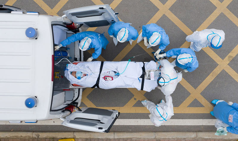 2020年3月6日,在湖北省武漢市的華中科技大學(xué)附屬同濟醫(yī)院中法新城院區(qū),醫(yī)護人員用負壓救護車轉(zhuǎn)運一位新冠肺炎患者做CT檢查(無人機照片)。