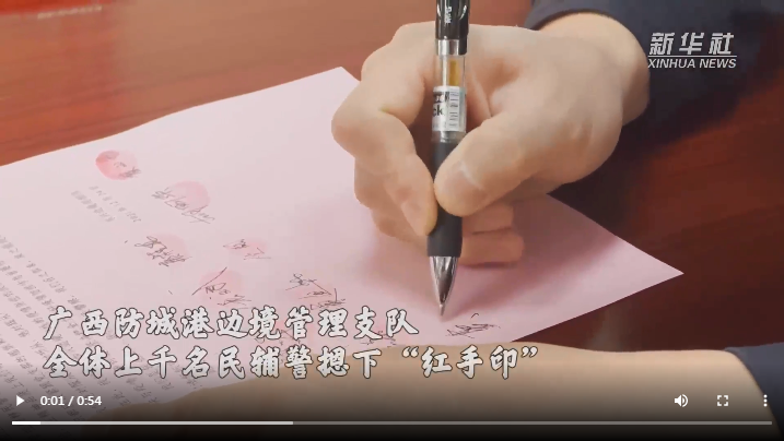 廣西防城港邊境管理支隊上千名民輔警集體遞交“戰(zhàn)疫請戰(zhàn)書”,主動要求向抗疫最前線靠攏。他們繼續(xù)選擇逆行,奔赴國門口岸、邊境卡口、村寨社區(qū),始終奮戰(zhàn)在最前線,維護(hù)檢測現(xiàn)場秩序,保障救援力量通行,強(qiáng)化邊境巡邏防控。“請戰(zhàn)書”上的一個個“紅手印”,見證忠誠。