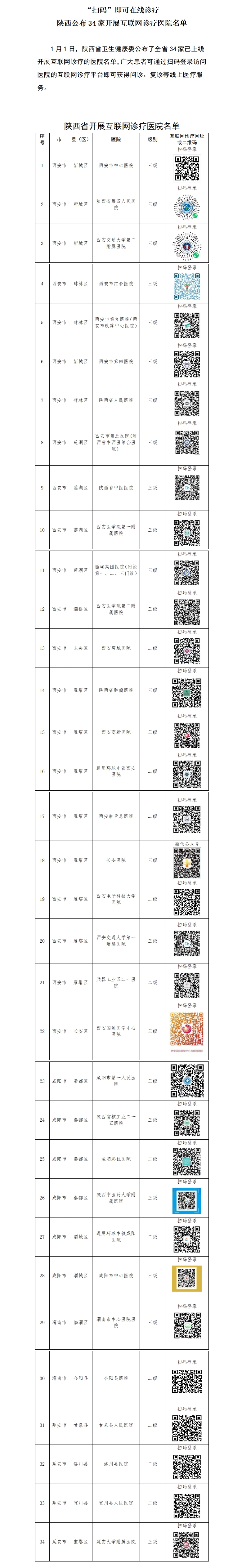 西安、咸陽(yáng)、渭南、延安34家醫(yī)院已上線互聯(lián)網(wǎng)診療服務(wù),廣大患者可通過(guò)掃碼登錄訪問(wèn)醫(yī)院的互聯(lián)網(wǎng)診療平臺(tái)即可獲得問(wèn)診、復(fù)診等線上醫(yī)療服務(wù)。