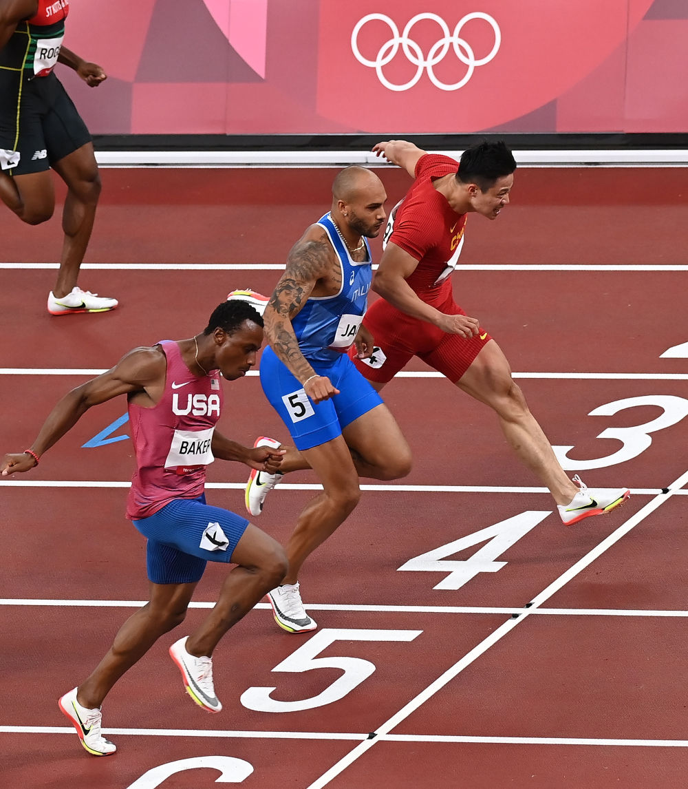 ↑2021年8月1日,東京奧運會田徑男子100米半決賽在東京新國立競技場舉行。中國選手蘇炳添(右一)跑出9秒83,以半決賽第一晉級決賽,同時創(chuàng)造了新的亞洲紀(jì)錄。