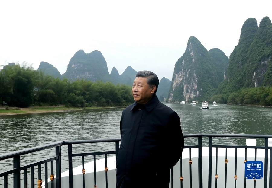 2021年4月25日至27日,中共中央總書(shū)記、國(guó)家主席、中央軍委主席習(xí)近平在廣西考察。這是25日下午,習(xí)近平在桂林市陽(yáng)朔縣,乘船考察漓江陽(yáng)朔段。