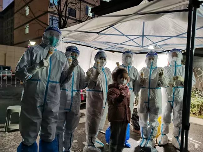 “姐姐,你冷不冷,你手疼不疼?”在排隊的隊伍中,一個小姑娘帶著哭腔問身著防護(hù)服的王航英。原來,王航英已經(jīng)連續(xù)采集核酸近十個小時,換班時她脫下手套,想抽一張紙,結(jié)果雙手被凍得通紅,反復(fù)幾次都沒成功。