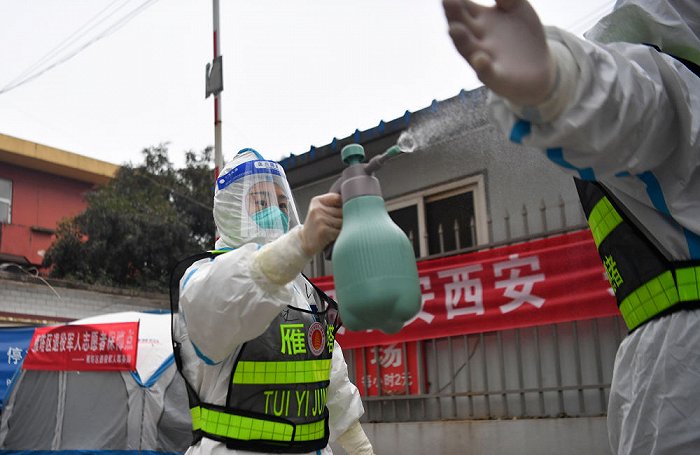↑1月7日,西安市雁塔區(qū)退役軍人志愿突擊隊(duì)隊(duì)員在一處核酸檢測點(diǎn)互相協(xié)助為防護(hù)服消毒。