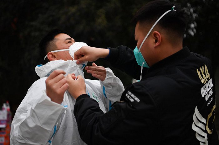 ↑1月7日,西安市雁塔區(qū)退役軍人志愿突擊隊(duì)隊(duì)員位娜娜協(xié)助隊(duì)友為防護(hù)服消毒。