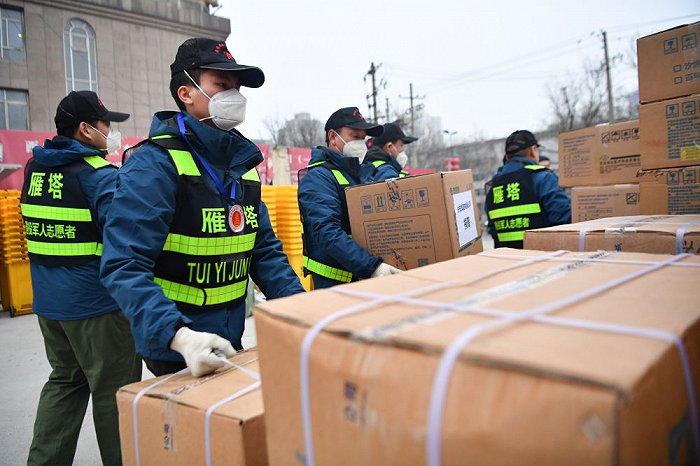 ↑1月6日,西安市雁塔區(qū)退役軍人志愿突擊隊(duì)隊(duì)員搬運(yùn)防疫物資。