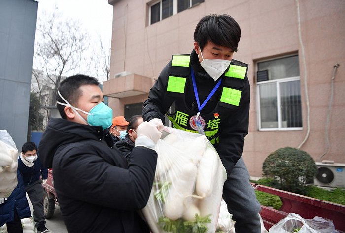 ↑1月6日,西安市雁塔區(qū)退役軍人志愿突擊隊(duì)隊(duì)員侯磊(右)協(xié)助社區(qū)工作人員搬運(yùn)物資。