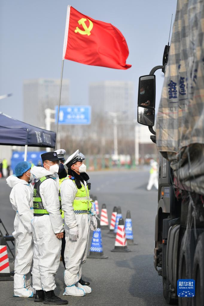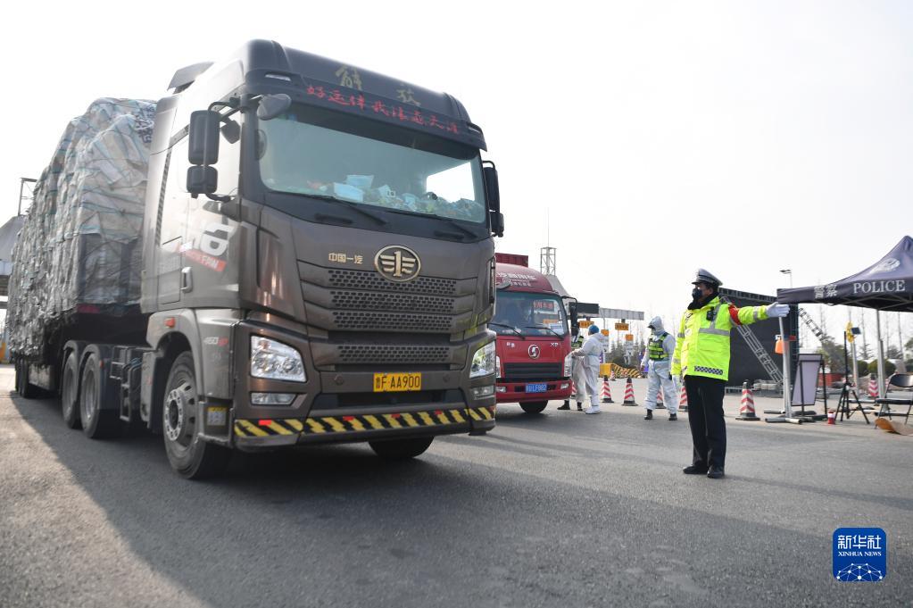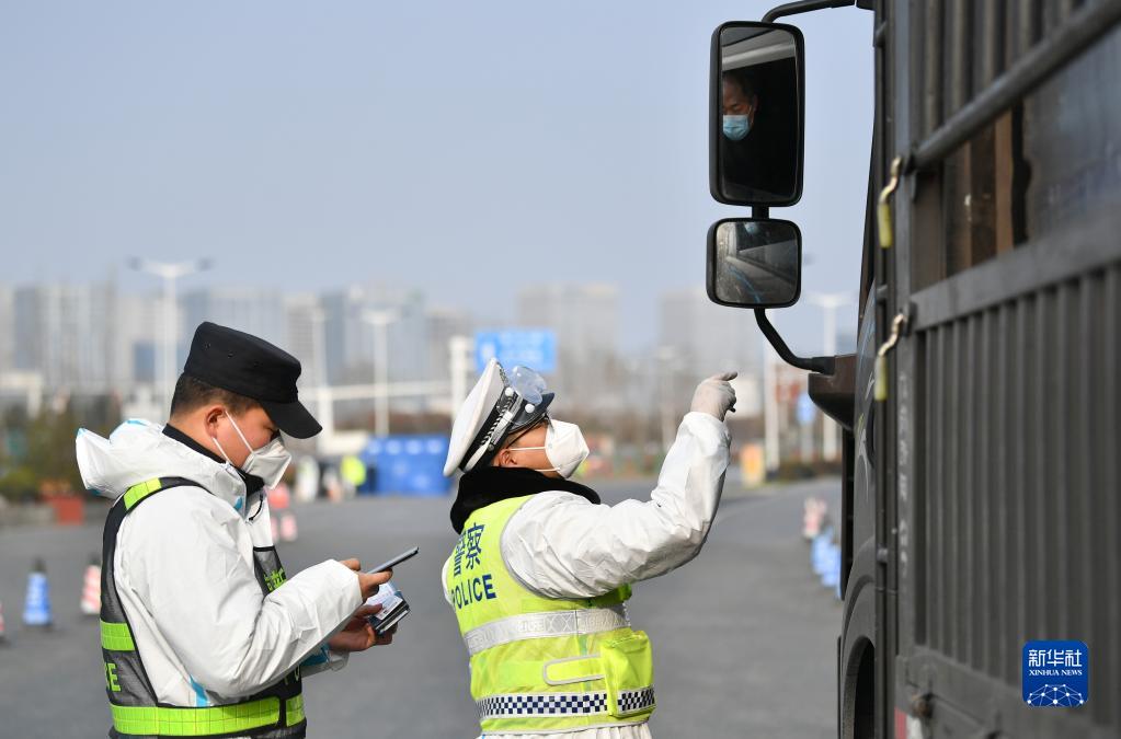 1月10日,西安市公安局浐灞生態(tài)區(qū)分局民警在西安市繞城高速新筑收費(fèi)站查驗(yàn)車輛通行證件。新華社記者 張博文 攝