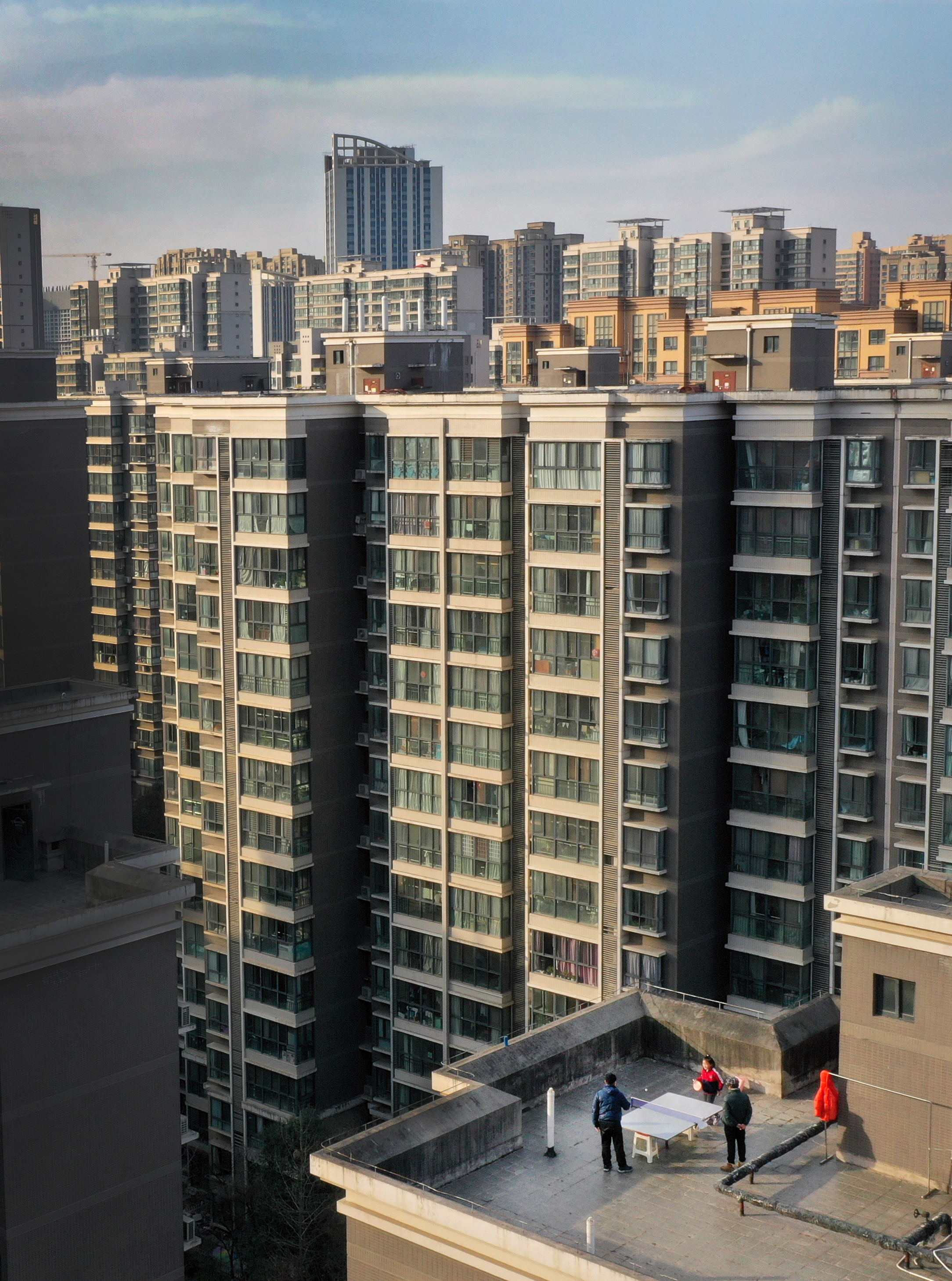 1月13日,西安市一小區(qū)居民在樓頂上打乒乓球(無人機(jī)照片)。新華社記者 陶明 攝