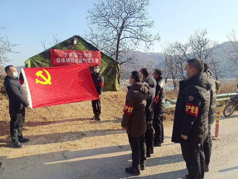 咸陽市長武縣丁家鎮(zhèn)丁陶路疫情防控臨時(shí)黨支部黨員向黨旗宣誓。 趙輝 攝