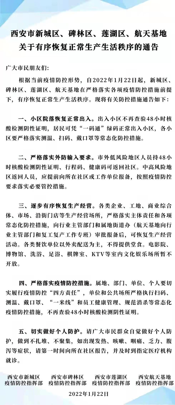1月22日,西安市四個區(qū)域疫情防控指揮部聯(lián)合發(fā)布通告:西安市新城區(qū)、碑林區(qū)、蓮湖區(qū)、航天基地自2022年1月22日起有序恢復(fù)正常生產(chǎn)生活。通告全文如下: