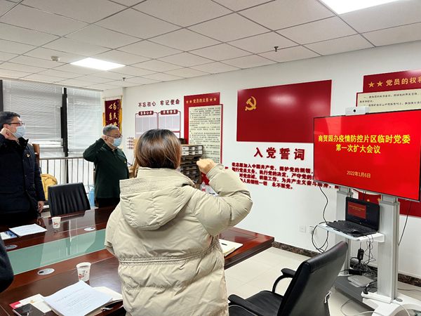 2022年1月6日,商貿園辦疫情防控片區(qū)臨時黨委在第一次擴大會議上重溫入黨誓詞。浐灞融媒體中心供圖